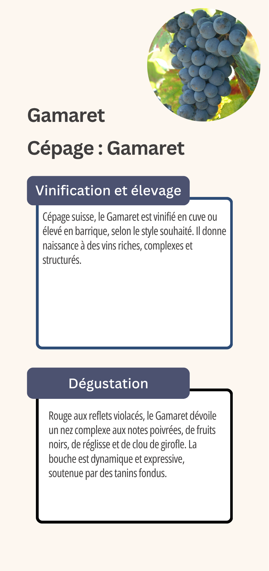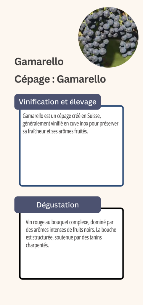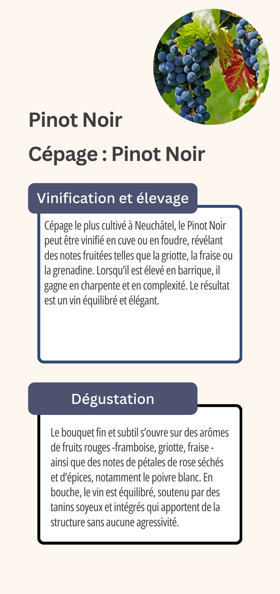 Le Pinot noir est considéré à juste titre comme le meilleur de Suisse. Ce vin doit sa belle couleur rubis et ses tanins à une cuvaison prolongée. Le Pinot noir présente une ampleur et une richesse qui ne demandent qu’à mieux s’exprimer par quelques années de garde. Il accompagne magnifiquement toutes les viandes et les fromages. Si le Pinot noir est jeune, vif et fruité, il peut accompagner la fondue et la raclette.